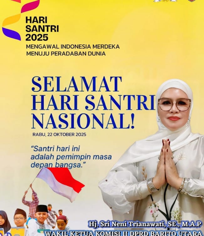 TENTANGKALTENG.ID, BARITO UTARA — Dalam momentum peringatan Hari Santri Nasional 2025 yang jatuh pada Selasa, 22 Oktober 2025, Wakil Ketua Komisi II DPRD Kabupaten Barito Utara, Hj. Sri Neni Trianawati, SE., M.A.P., menyampaikan pesan penuh...